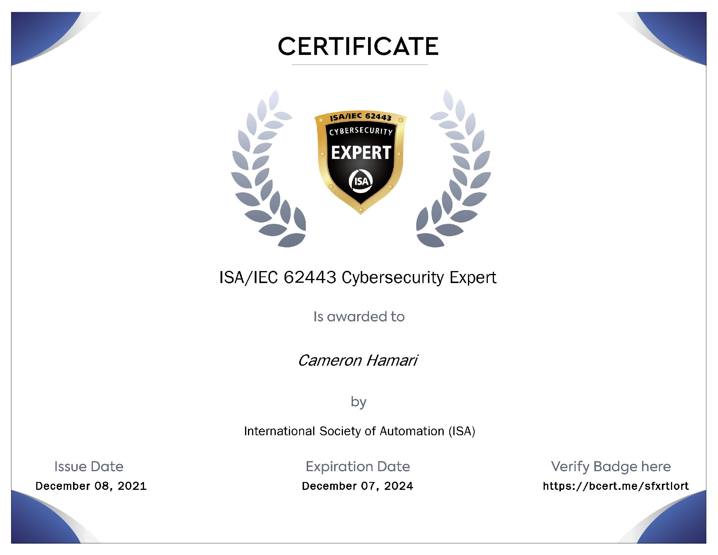 Congratulations to Cameron!In this day and age, cybersecurity is of utmost importance. We are proud to announce Controls Engineer Cameron Hamari has earned his ISA/IEC 62443 Cybersecurity Expert stat