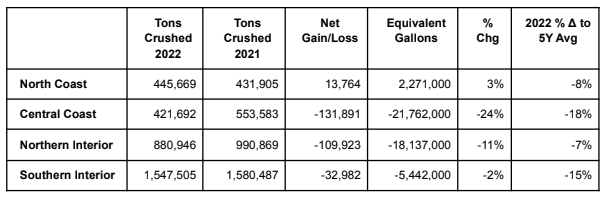 (February 10, 2023, Novato, CA) – The California Department of Food & Agriculture’s Preliminary Grape Crush Report for 2022 was released today. The crush of 3.349 million tons stayed in line with