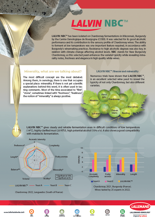 https://development.wineindustrynetwork.com/LALVIN NBC™ has been isolated on Chardonnay fermentations in Mâconnais, Burgundy by the Centre Oenologique de Bourgogne (COEB). It was selected for its good alcoholic performance and its contributi